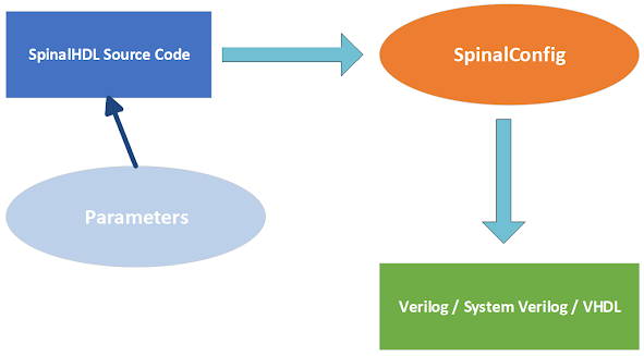 As illustrated above, the general design flow for SpinalHDL is to: 1. Setup the Parameters of the SpinalHDL top module 2. Feed the source code into SpinalConfig 3. Generate the output in Verilog, System Verilog or VHDL